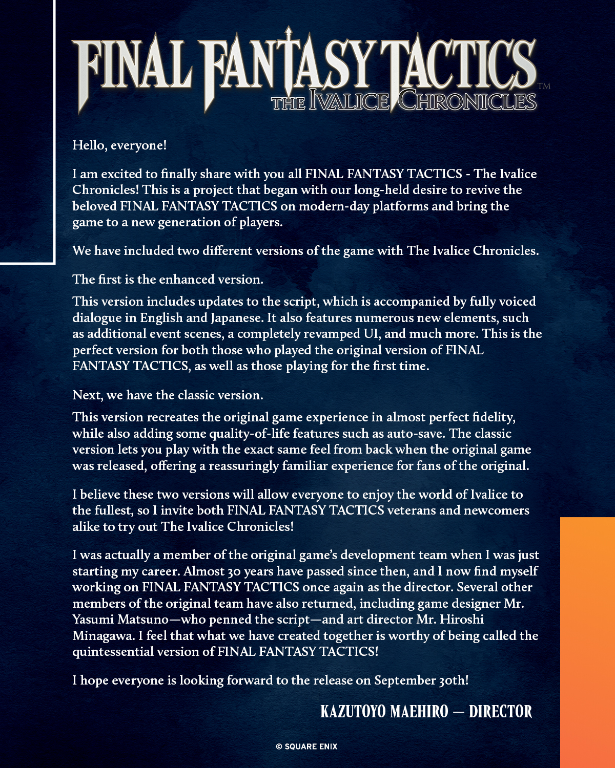 The legendary Tactical RPG Final Fantasy Tactics: The Ivalice Chronicles was released today on September, 2025 for Playstation 5, Nintendo Switch, PC and Xbox Series X. This is a remake of the original timeless classic "Final Fantasy Tactics" originally released in 1997 for the Playstation 1, brought forward for modern consoles. The exciting content of this remake is it brings fully fledged voice acting in English and Japanese for all audiences, gameplay tweaks, updated visuals including the option to play the game in the original artstyle and UI with multiple original staff returning to rework on the project again, such as Yasumi Matsuno himself.